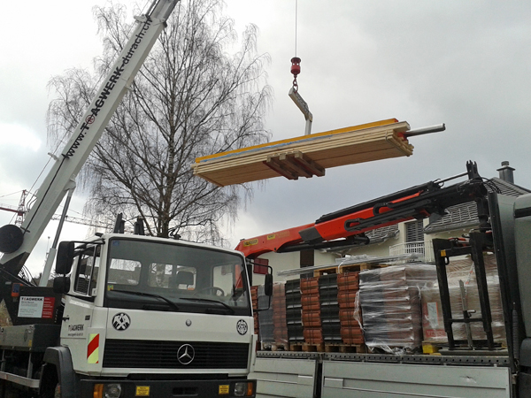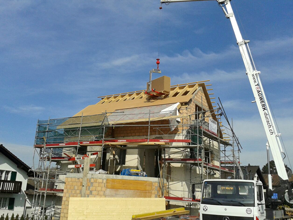 Unser Mobilkran ermöglicht nicht nur schnellere und somit kostengünstigere Ausführung der Zimmerer- und Dachdeckerarbeiten, sondern auch das Arbeiten in luftiger Höhe. Zur Hebebühne umgebaut erreicht er eine Höhe von 27 m.